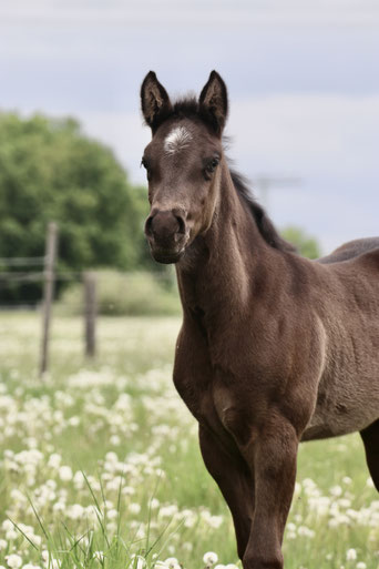 Viel typvoller geht nicht mehr! Das 7. Fohlen aus dieser bewährten Anpaarung hat uns wieder völlig umgehauen! Unglaubliche Bemuskelung schon von Geburt an! Audrucksstark! Lieb und dem Menschen zugewandt! Er möchte einfach immer alles recht machen! Der Sniper! Ein Traum! Bitte lasst euch nicht von der Fellfarbe irritieren. Das schwarze Fohlenfell bleicht in der heißen brandenburger Sonne schnell aus! Aber er wird später lackschwarz werden! Sniper kann Ende September/Anfang Oktober ausziehen. Er wird dann halfterführig sein, alle 6 Wochen entwurmt, regelmäßig die Hufe gemacht bekommen haben, 2 x Tetanus u. 1x Influenza geimpft sein. AQHA Papier liegt vor, Equidenpass beantragt. Unsere Fohlen gehen zur Abholung auch 1 A freiwillig und ohne Zwang in den Hänger, weil sie einfach Vertrauen haben und immer gut gehändelt wurden. Endstockmaß ca. 150 cm. Die Besitzer seiner Vollgeschwister lieben ihre Flambo x Rosie Pferde. Sie sind gute Gelände-Pferde und eigenen sich besonders für Disziplinen am Rind. Sie haben die notwendige Aufrichtung für Working Equitation, sind sensibel aber haben auch die nötige Ruhe. Vebundenheit zu ihrem Mensch ist ihnen wichtig. Über seine Eltern ist er 5 Panel u. Imm n/n.